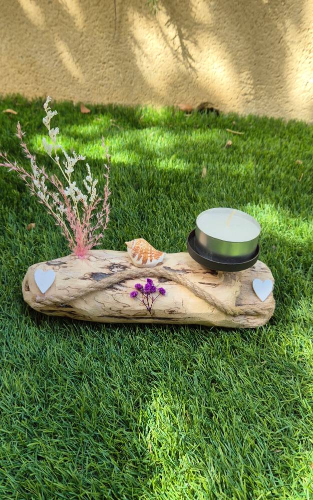 Bois flotté avec bougie et fleurs séchées