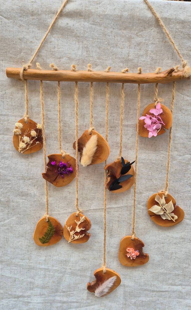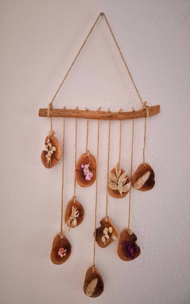 Suspension, bois et fleurs séchées