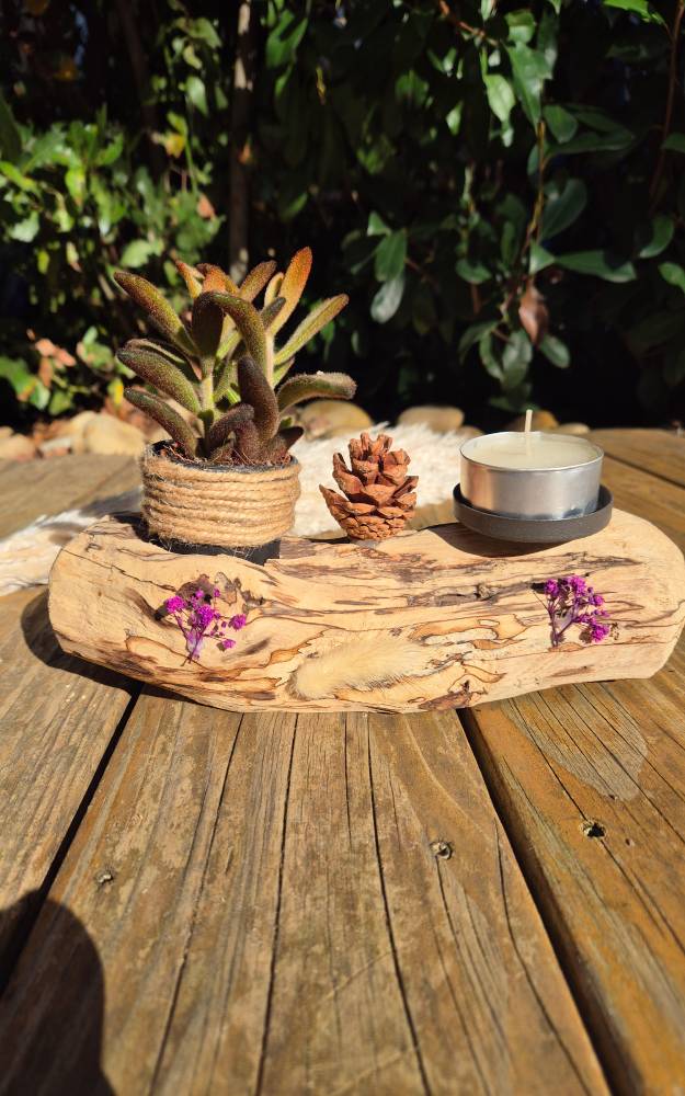 Morceau de bois flotté avec bougie et plante