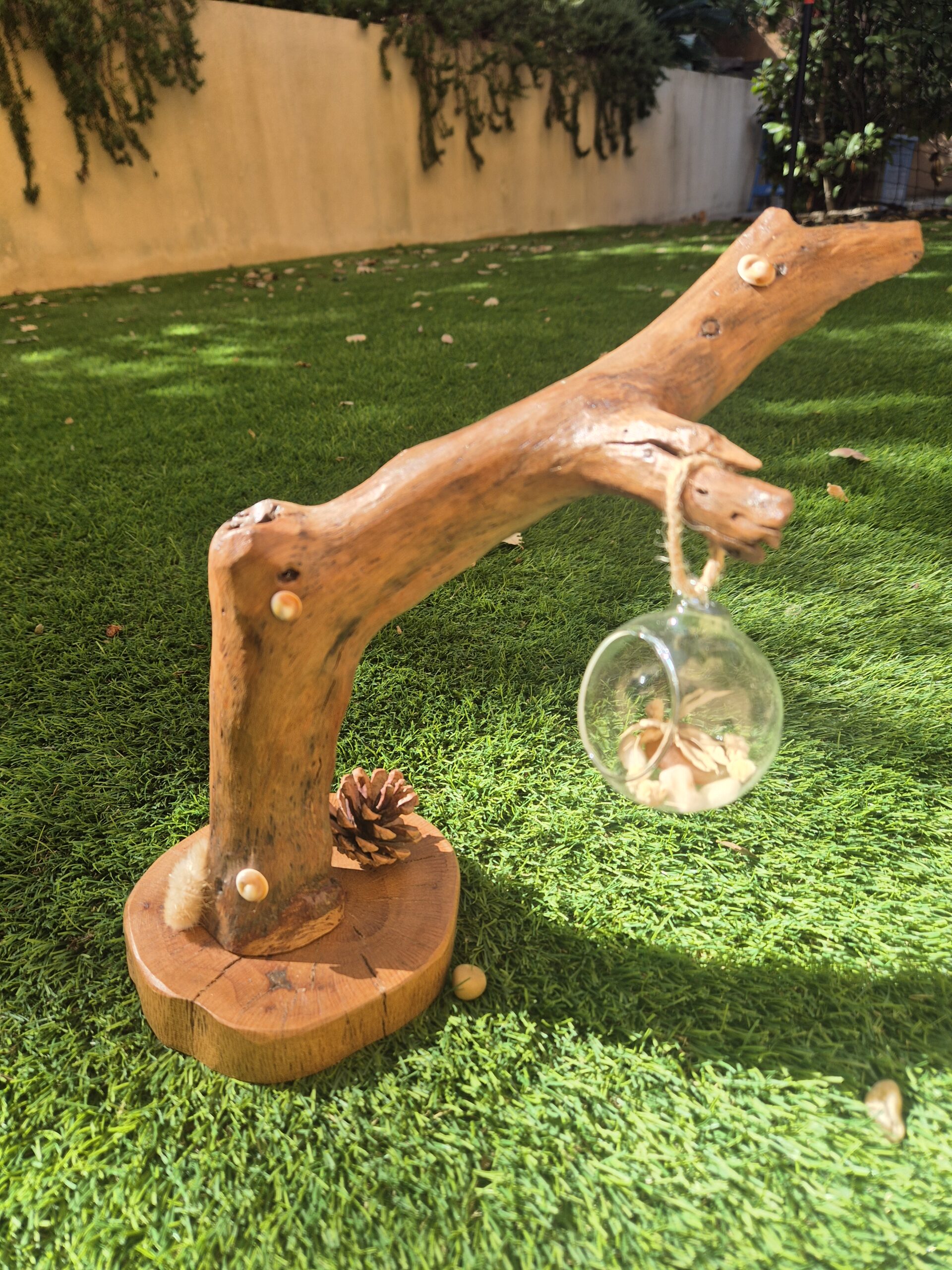 Décoration en bois, poncée et vernie de couleur teck accompagnée de sa petite boule en verre, de yeux de Sainte Lucie, d'une pomme de pin et de fleurs séchées.