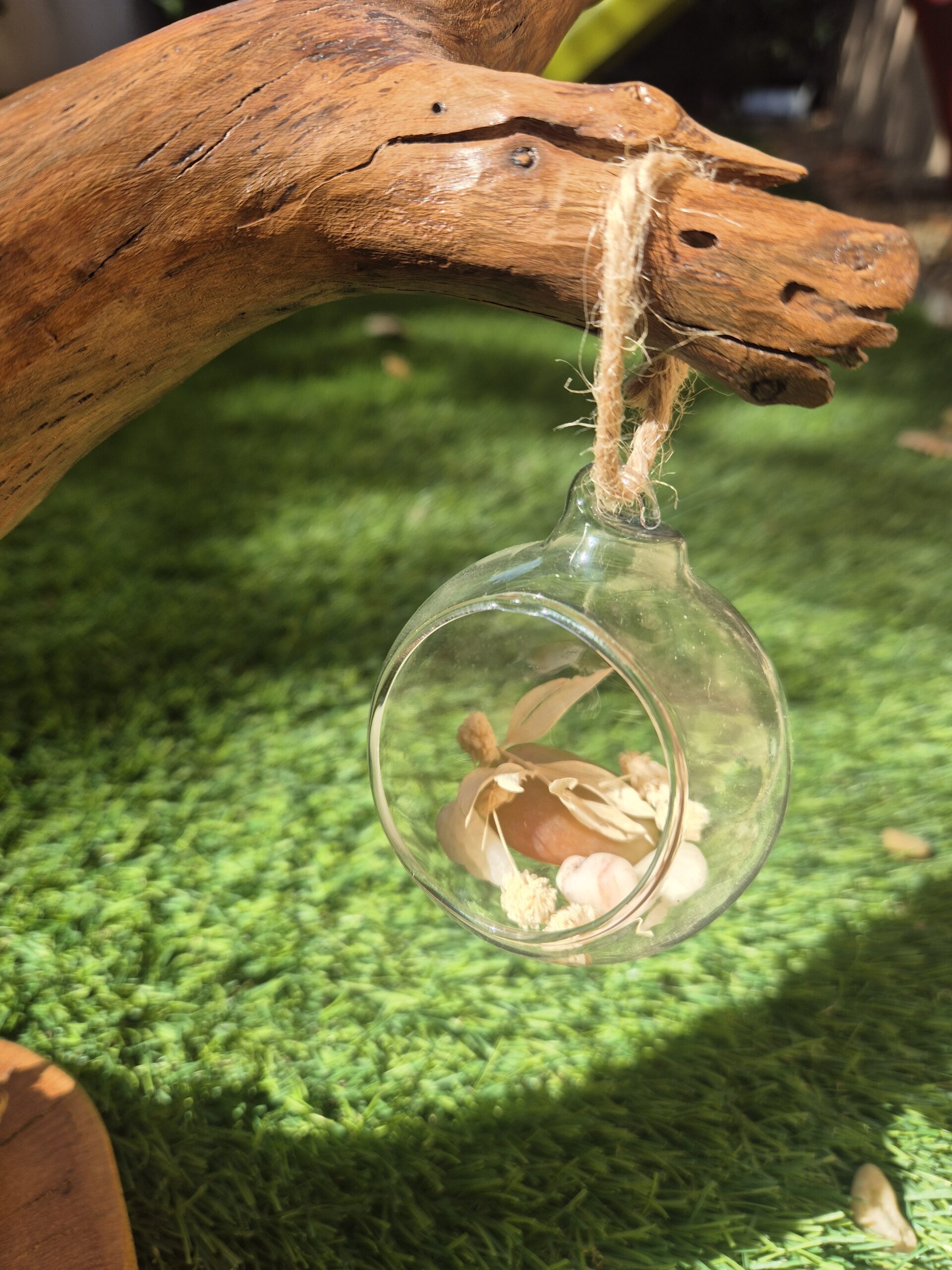 Eléments décoratifs présents sur le produit: fleurs séchées et petites pierres dans un petit photophore suspendue en verre, yeux de sainte lucie, pommes de pin et fleurs séchées.