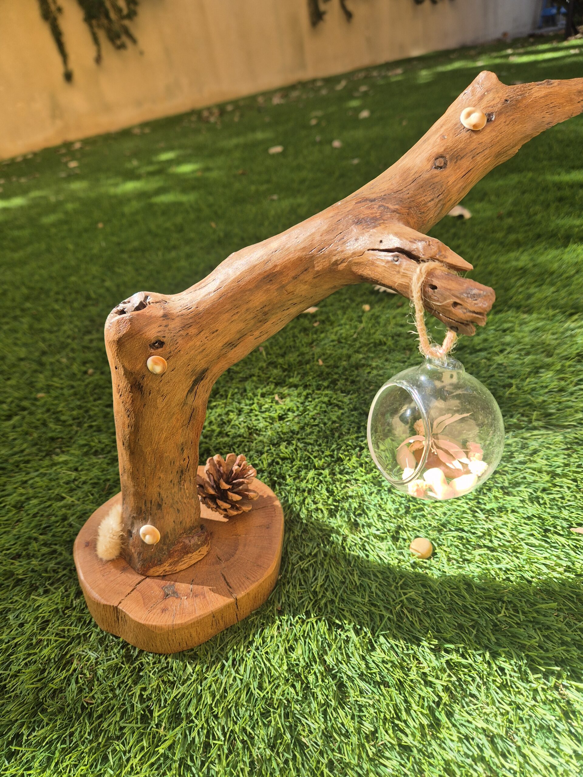 Décoration en bois flotté, poncée et vernie couleur teck.