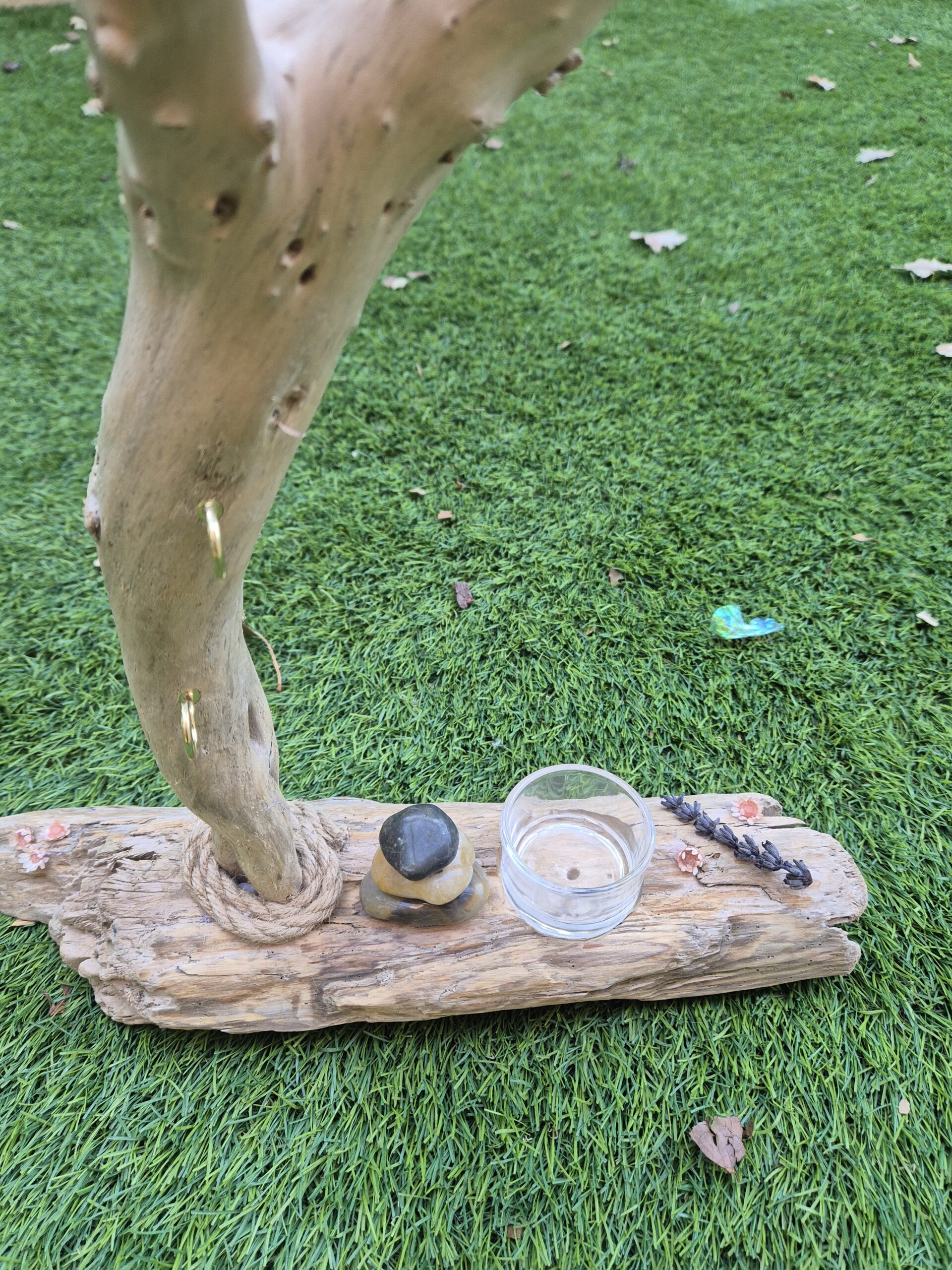 Les crochets aux nombres de 10, sont couleur or. Des fleurs séchées et quelques pierres colorées sont présentes sur le socle.
