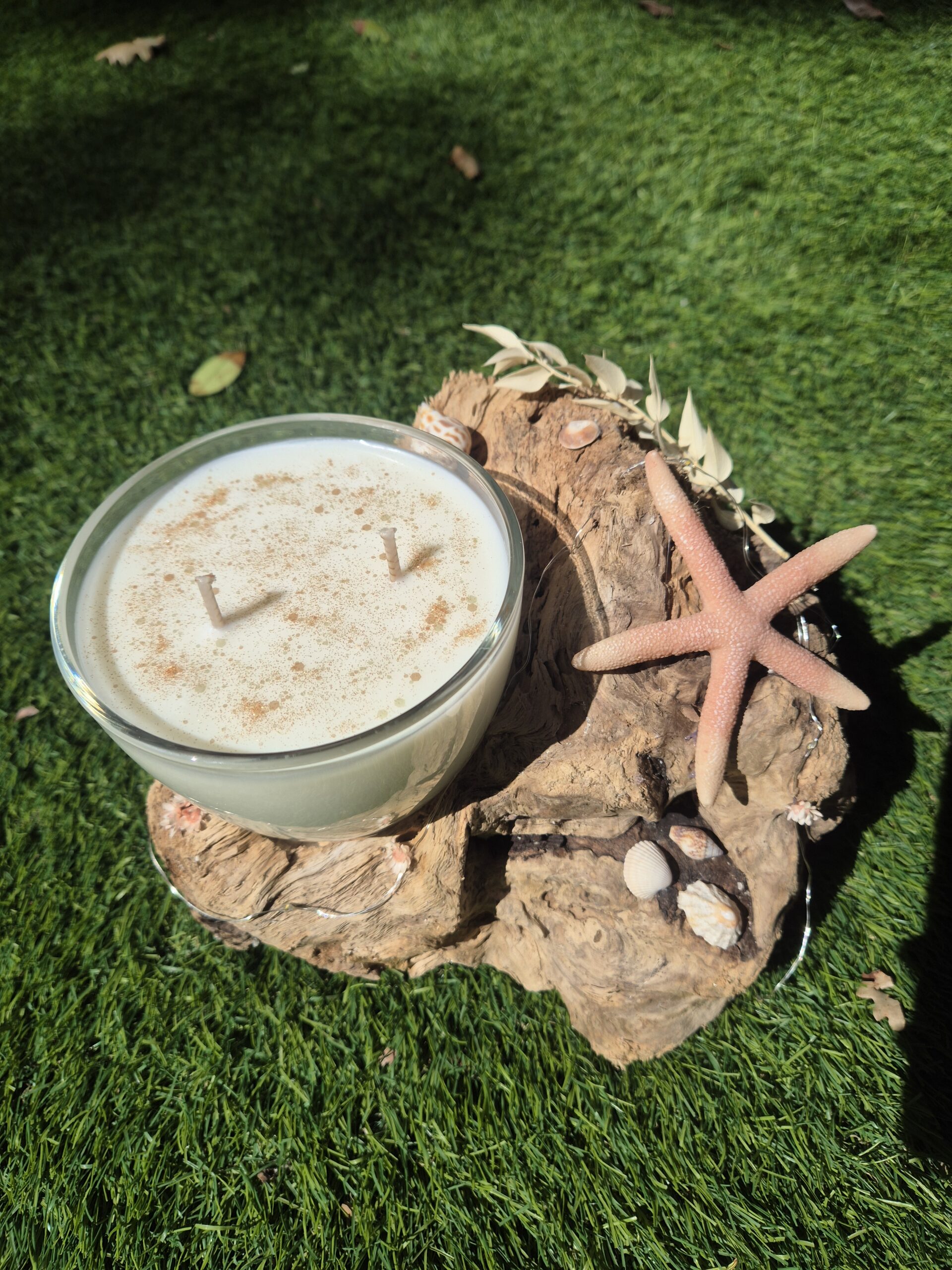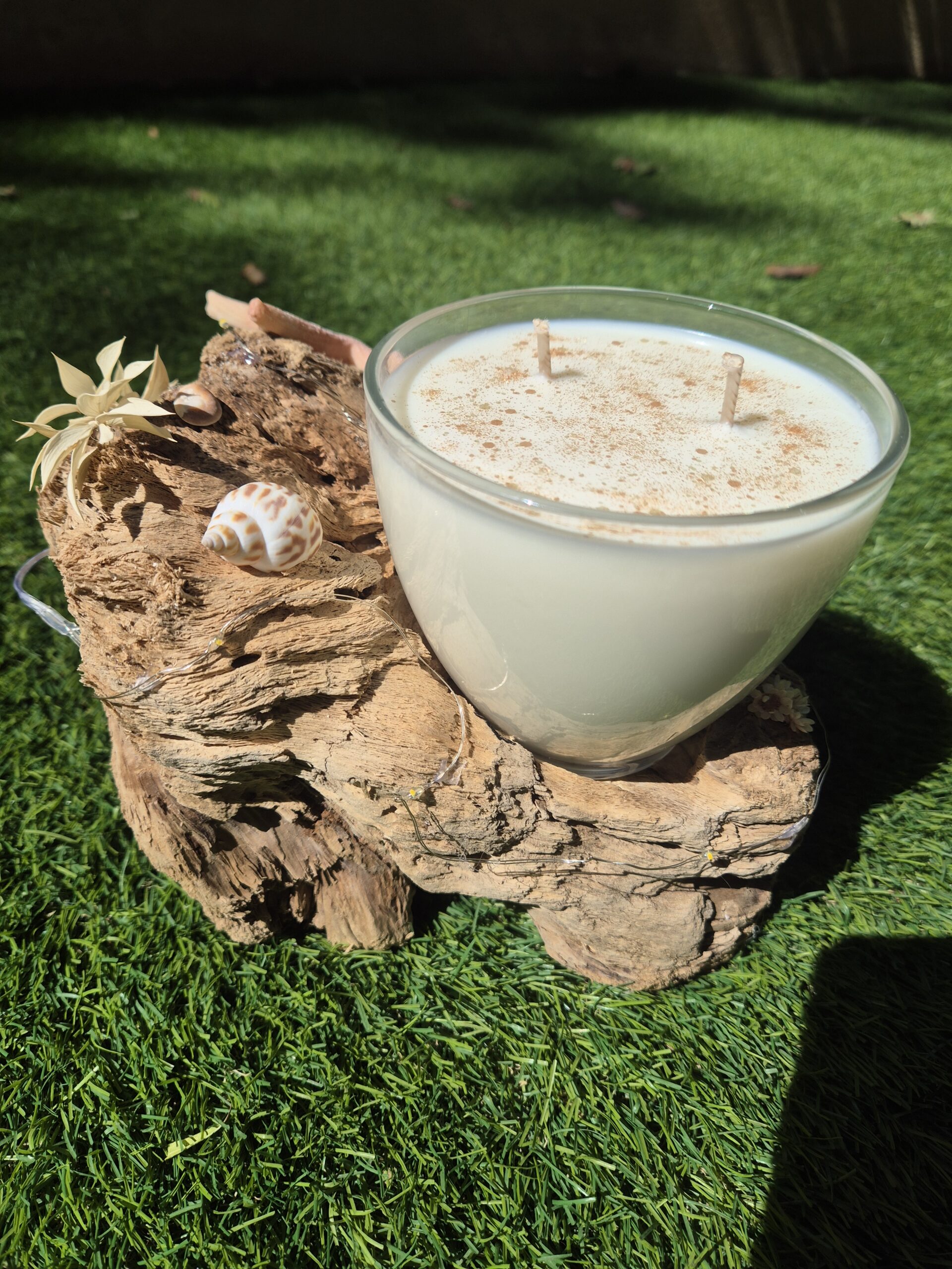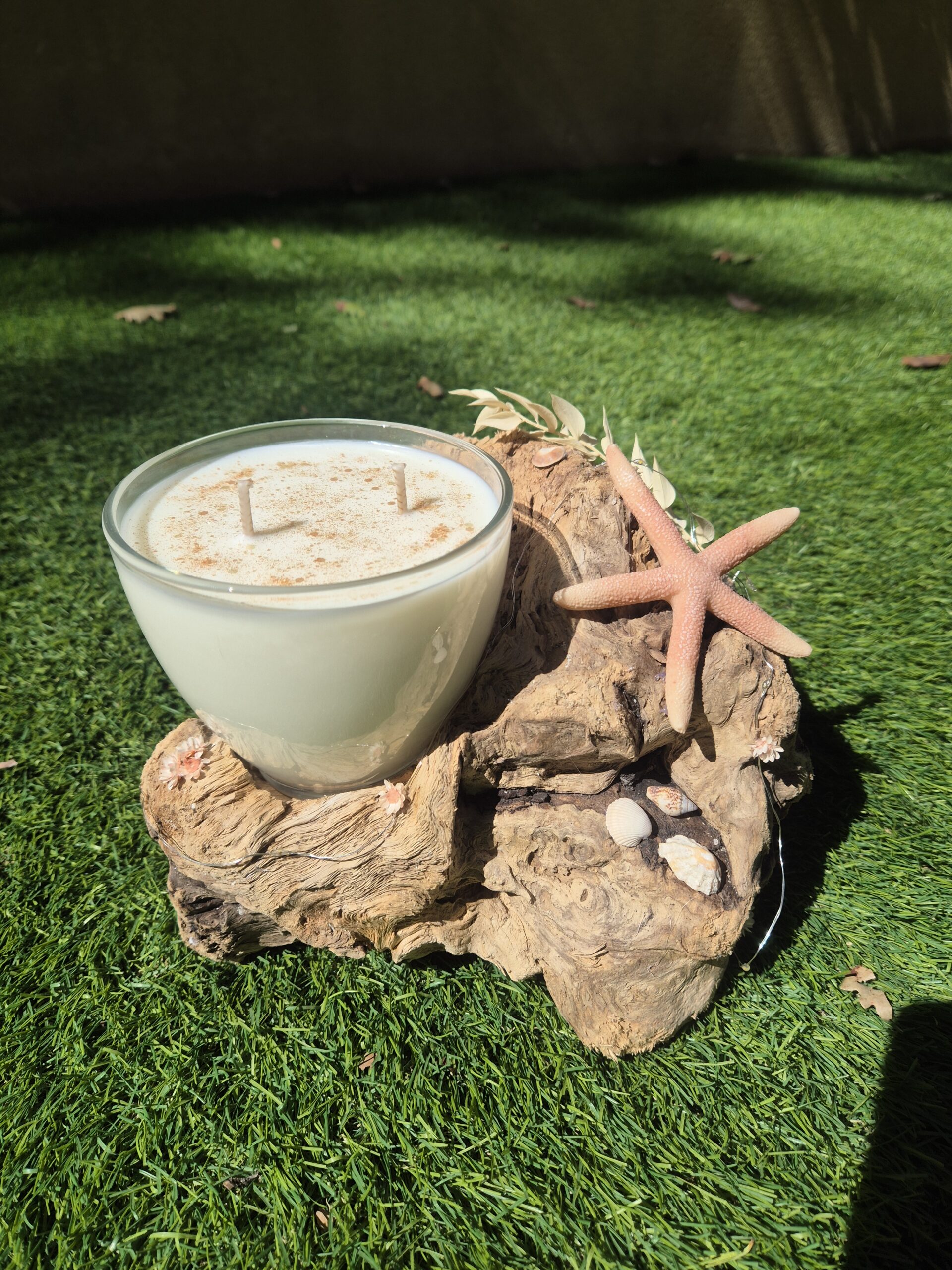 Grande bougie artisanale au parfum de monoï, mise en valeur sur un imposant morceau de bois flotté orné d’éléments marins, évoquant une ambiance estivale et apaisante.