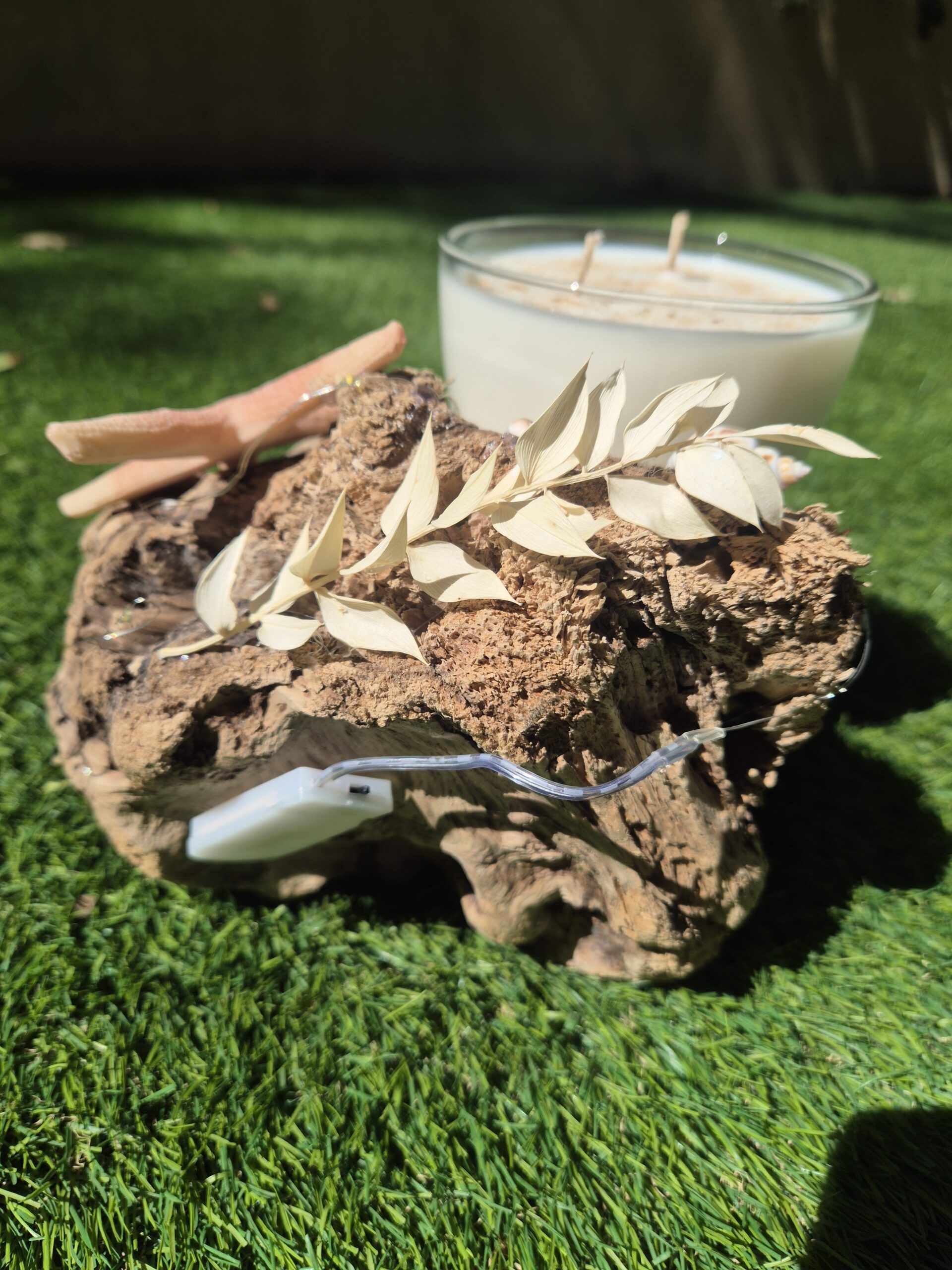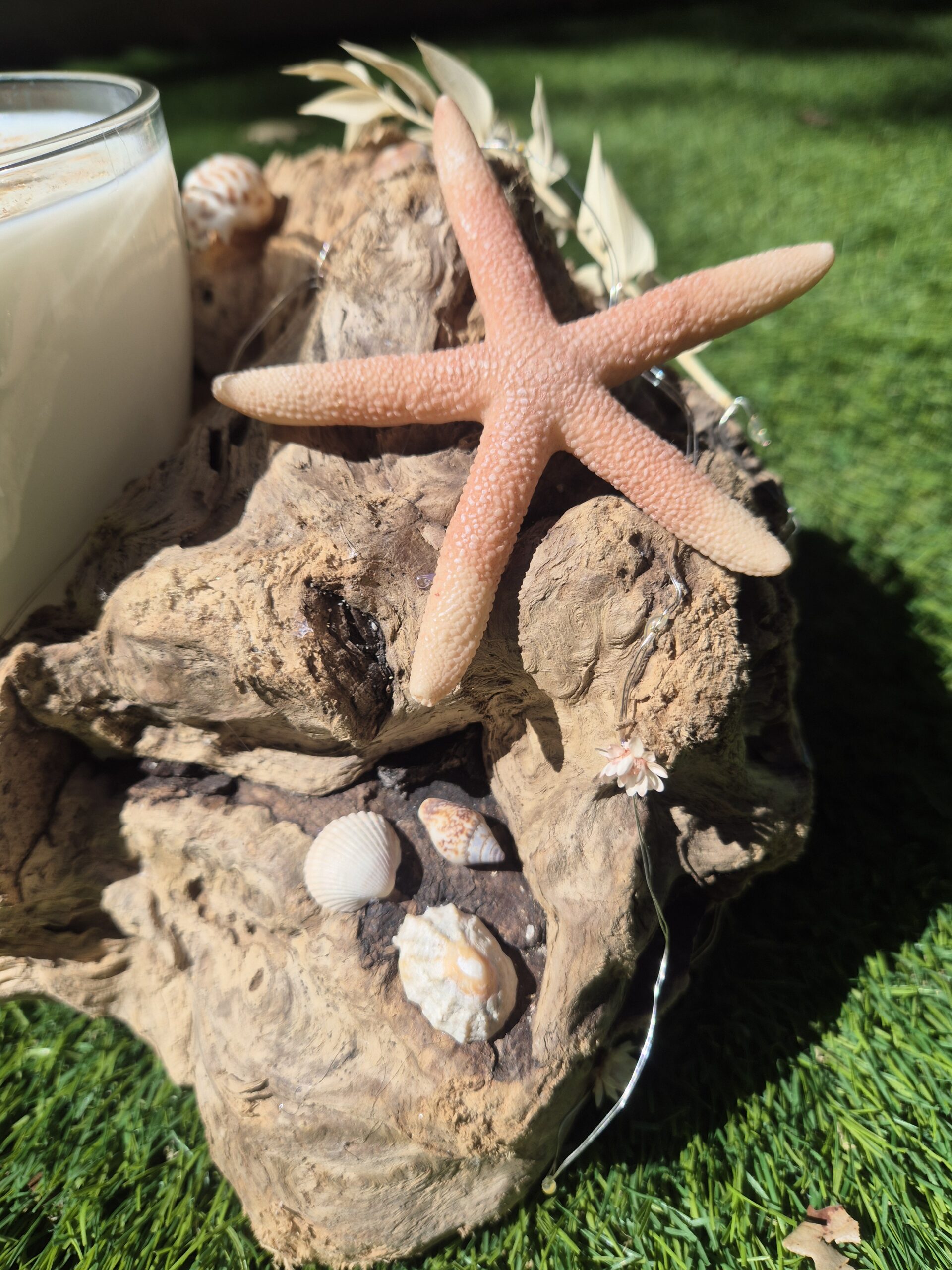 Grande bougie sur bois flotté. Bougie artisanale au parfum de monoï, mise en valeur sur un morceau de bois flotté orné d’éléments marins.
