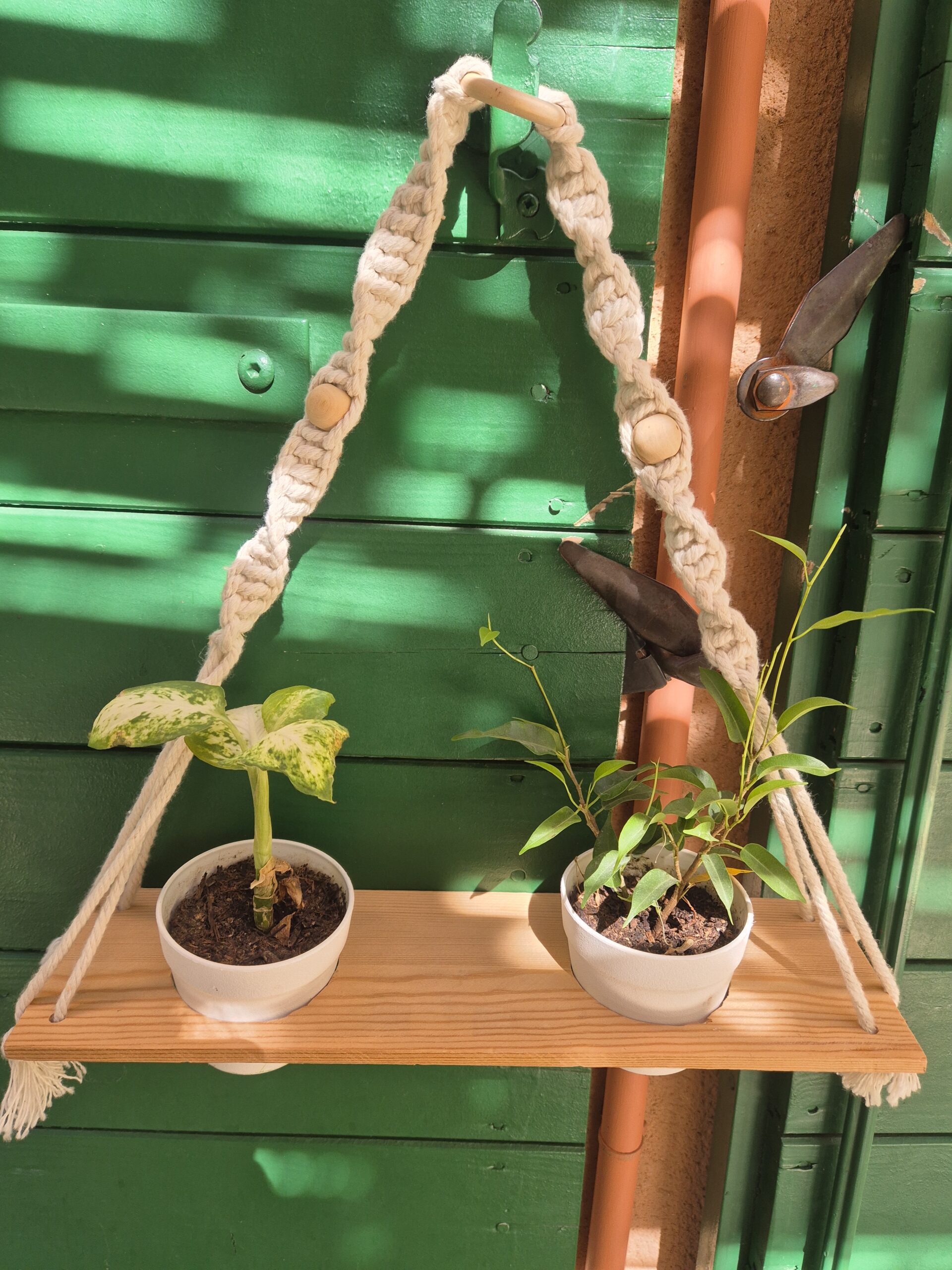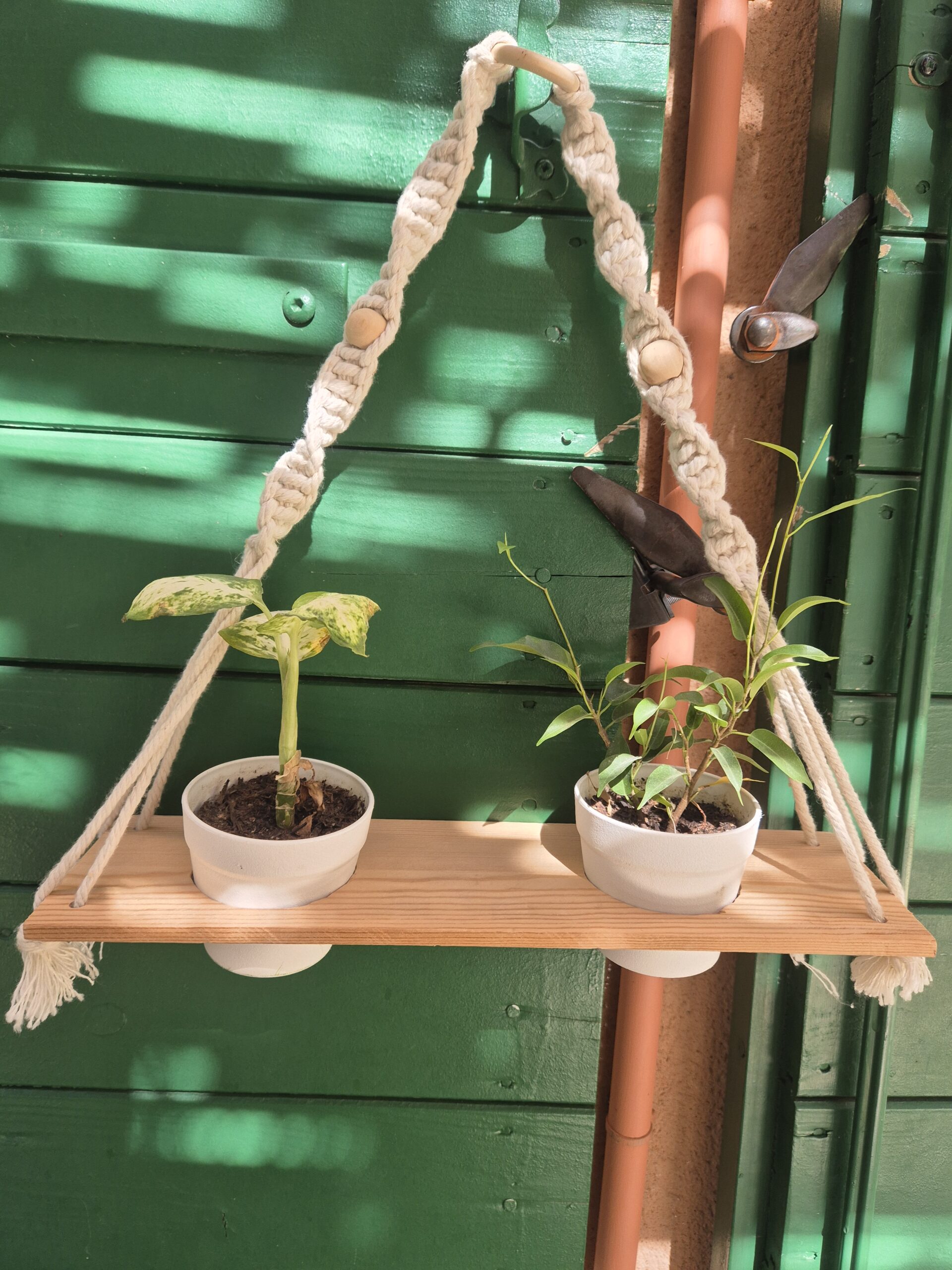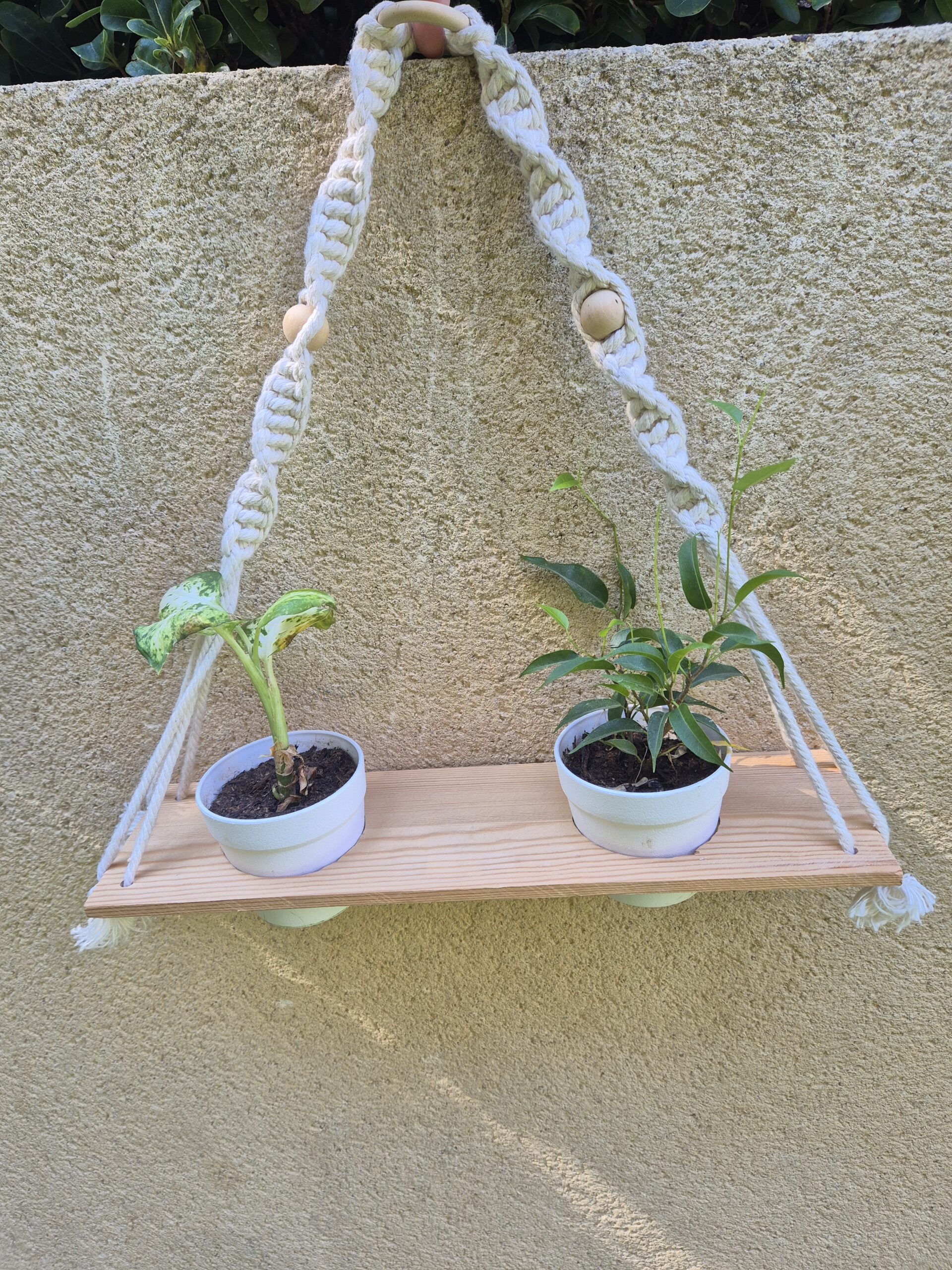 Suspension en bois et macramé recyclée avec deux trous pour y installer deux petits pots de fleurs blanc et y planter de petites plantes.